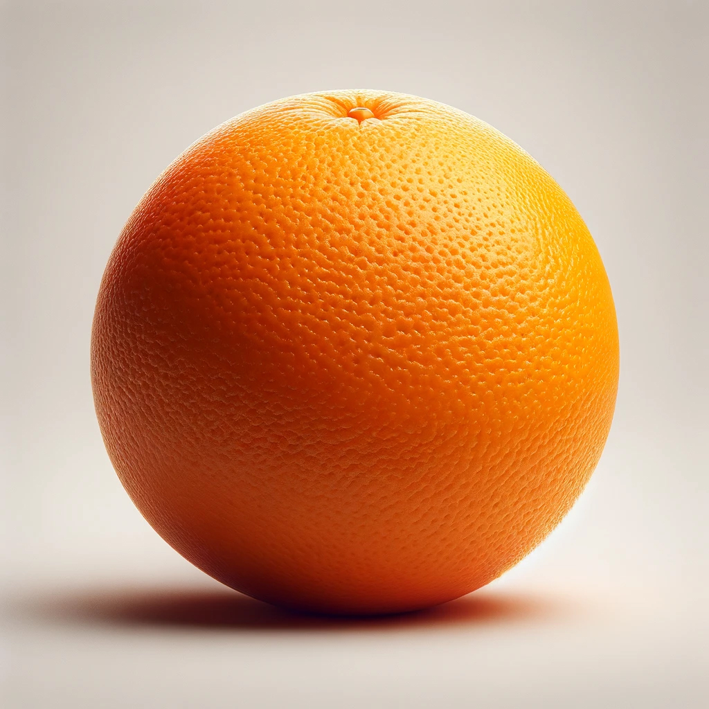 Une image très détaillée et réaliste d'un seul fruit orange entier isolé sur un fond blanc uni, remplissant entièrement le cadre sans dépasser ses limites. L'orange n'est pas coupée en deux, et il n'y a qu'une seule orange dans l'image. L'image est très précise, mettant en évidence la texture granuleuse de la peau. L'orange est éclairée par une lumière douce qui souligne néanmoins sa forme ronde, et l'orange est dépourvue de feuilles.