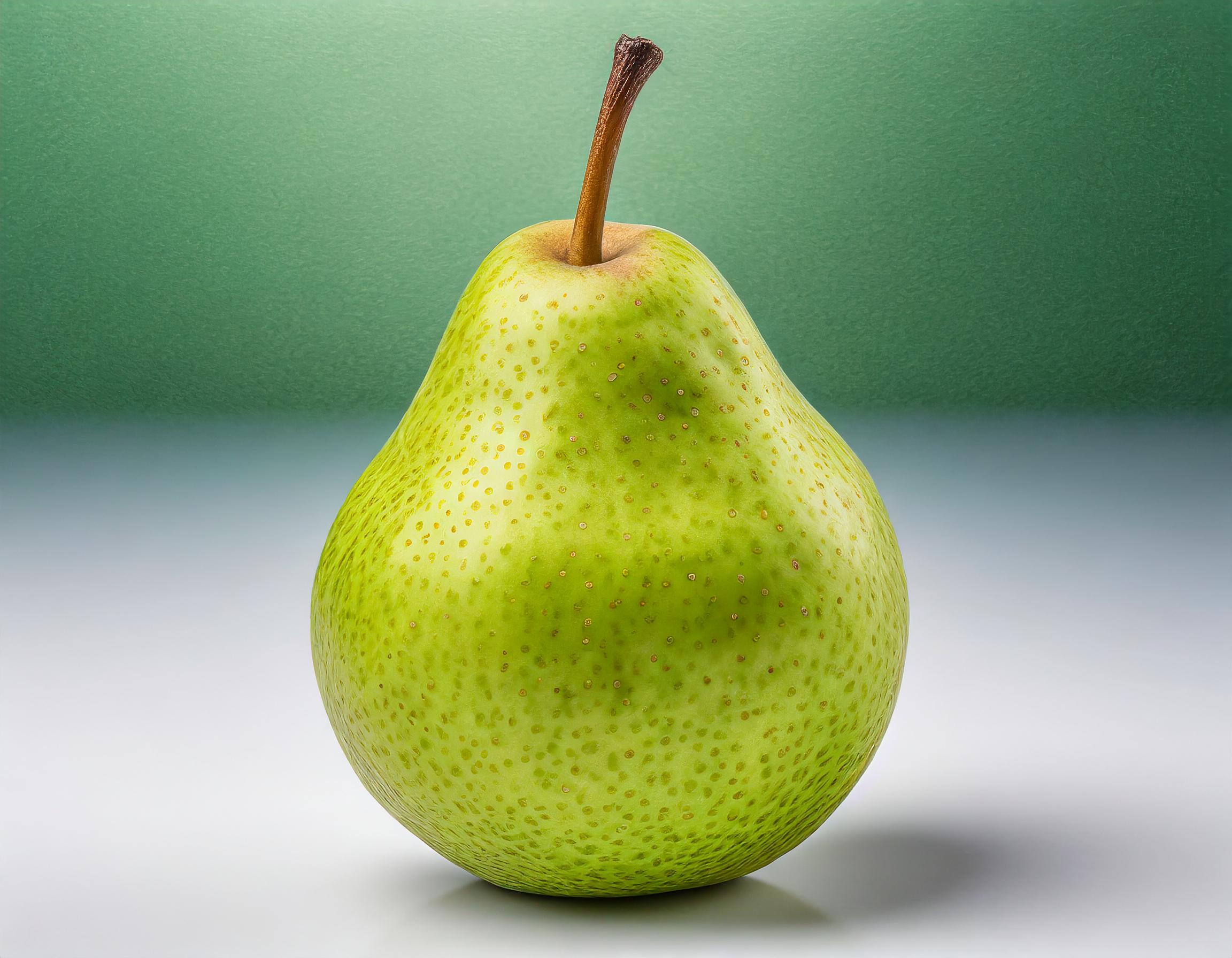 Une image très détaillée et réaliste d'une poire verte isolée sur un fond blanc uni. Le fruit remplit entièrement le cadre sans dépasser ses limites, intact, non coupé en deux, et il n'y a qu'une seule poire. L'image est très détaillée, mettant en avant la texture de la peau de la poire. La poire est éclairée par une lumière douce, soulignant sa forme sans feuilles.