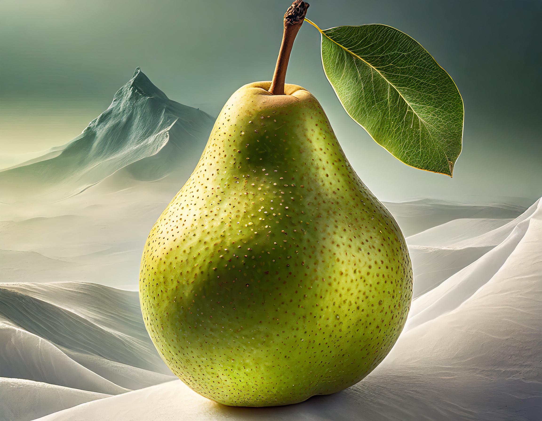 Une image très détaillée et réaliste d'une poire verte isolée sur un fond blanc uni. Le fruit remplit entièrement le cadre sans dépasser ses limites, intact, non coupé en deux, et il n'y a qu'une seule poire. L'image est très détaillée, mettant en avant la texture de la peau de la poire. La poire est éclairée par une lumière douce, soulignant sa forme sans feuilles.