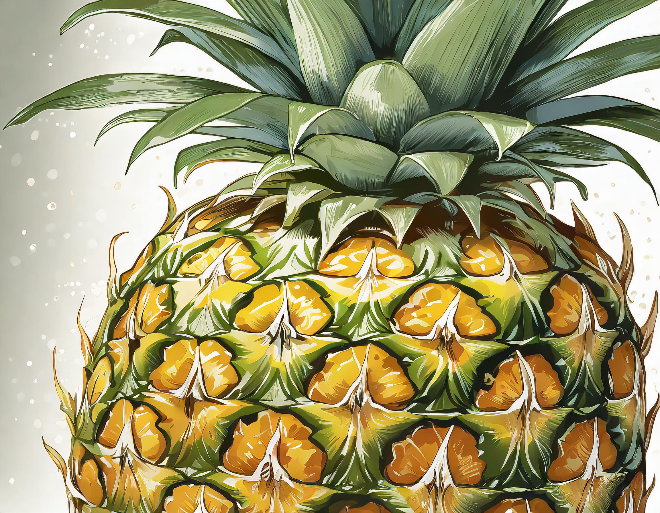 Une image très détaillée et réaliste d'un seul ananas isolé sur un fond blanc uni. Le fruit remplit l'intégralité du cadre sans déborder. L'ananas est entier, pas coupé en deux, et il n'y a qu'un seul ananas. L'image est très précise, mettant en valeur la texture de la peau de l'ananas. Il est éclairé par une lumière douce, soulignant sa forme. L'ananas est sans feuilles.