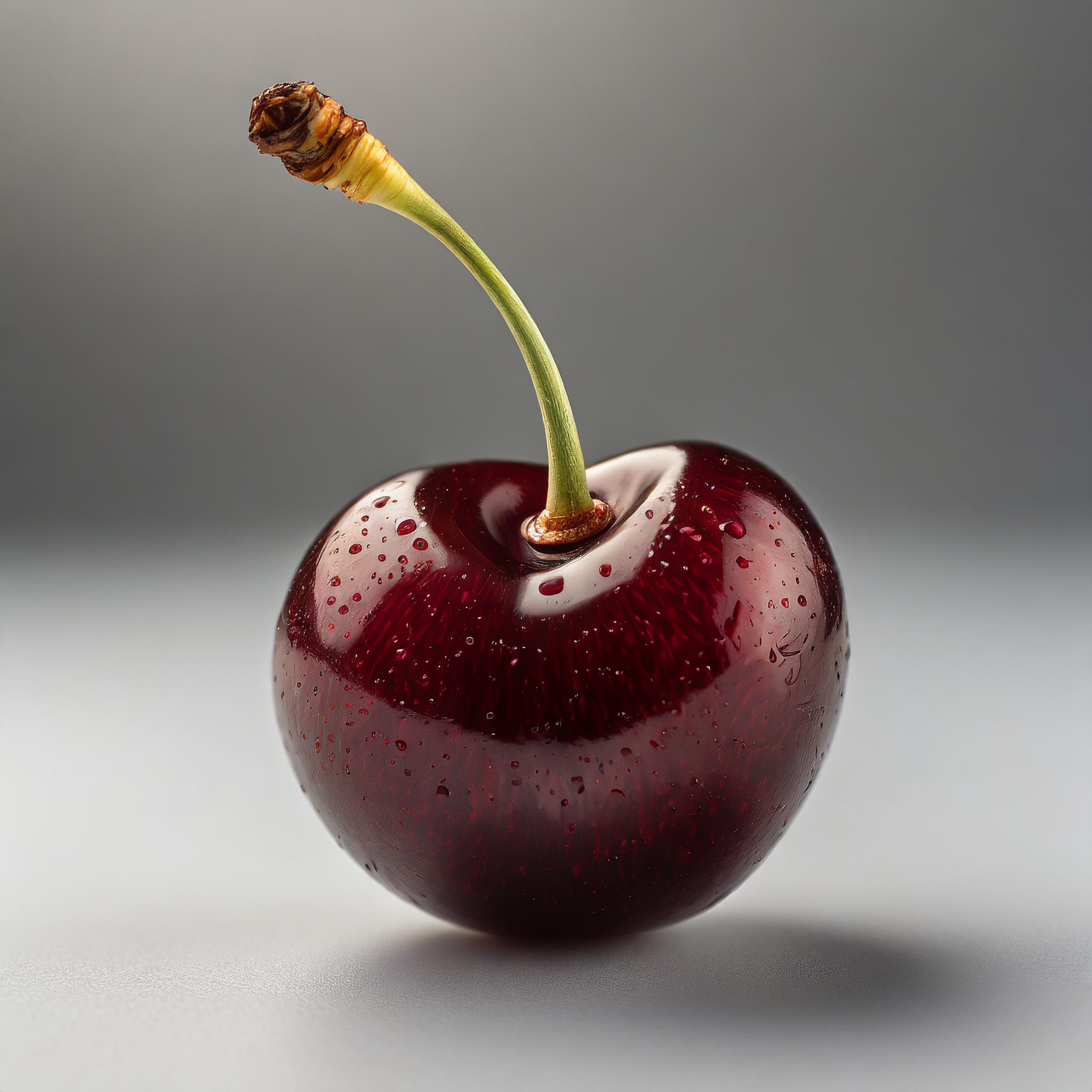 Une image très détaillée et réaliste d'une seule cerise isolée sur un fond blanc uni. Le fruit remplit l'ensemble du cadre sans le dépasser, parfaitement contenu dans les limites. C'est une cerise entière, pas coupée en deux, et il n'y en a qu'une. L'image est très précise, mettant en valeur la texture de la peau de la cerise. La cerise est illuminée par une lumière douce qui parvient encore à souligner sa forme. Il n'y a pas de feuilles attachées à la cerise.