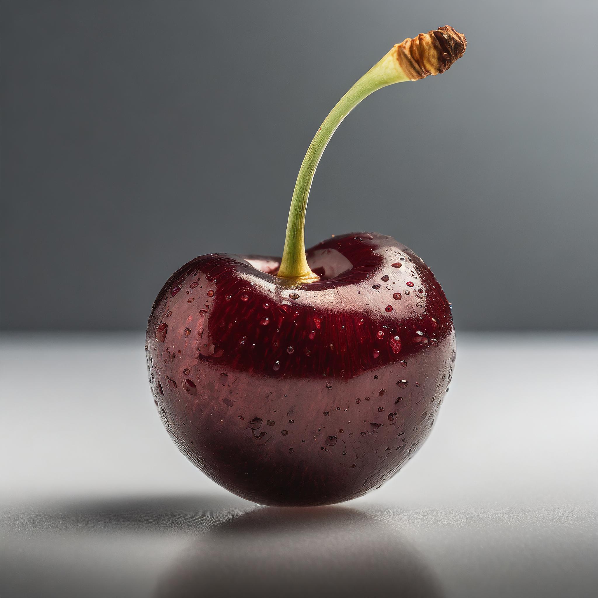 Une image très détaillée et réaliste d'une seule cerise isolée sur un fond blanc uni. Le fruit remplit l'ensemble du cadre sans le dépasser, parfaitement contenu dans les limites. C'est une cerise entière, pas coupée en deux, et il n'y en a qu'une. L'image est très précise, mettant en valeur la texture de la peau de la cerise. La cerise est illuminée par une lumière douce qui parvient encore à souligner sa forme. Il n'y a pas de feuilles attachées à la cerise.