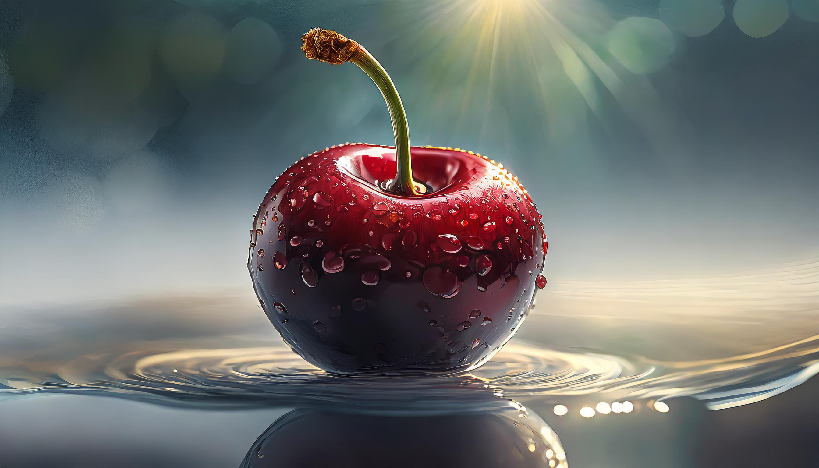 Une image très détaillée et réaliste d'une seule cerise isolée sur un fond blanc uni. Le fruit remplit l'ensemble du cadre sans le dépasser, parfaitement contenu dans les limites. C'est une cerise entière, pas coupée en deux, et il n'y en a qu'une. L'image est très précise, mettant en valeur la texture de la peau de la cerise. La cerise est illuminée par une lumière douce qui parvient encore à souligner sa forme. Il n'y a pas de feuilles attachées à la cerise.