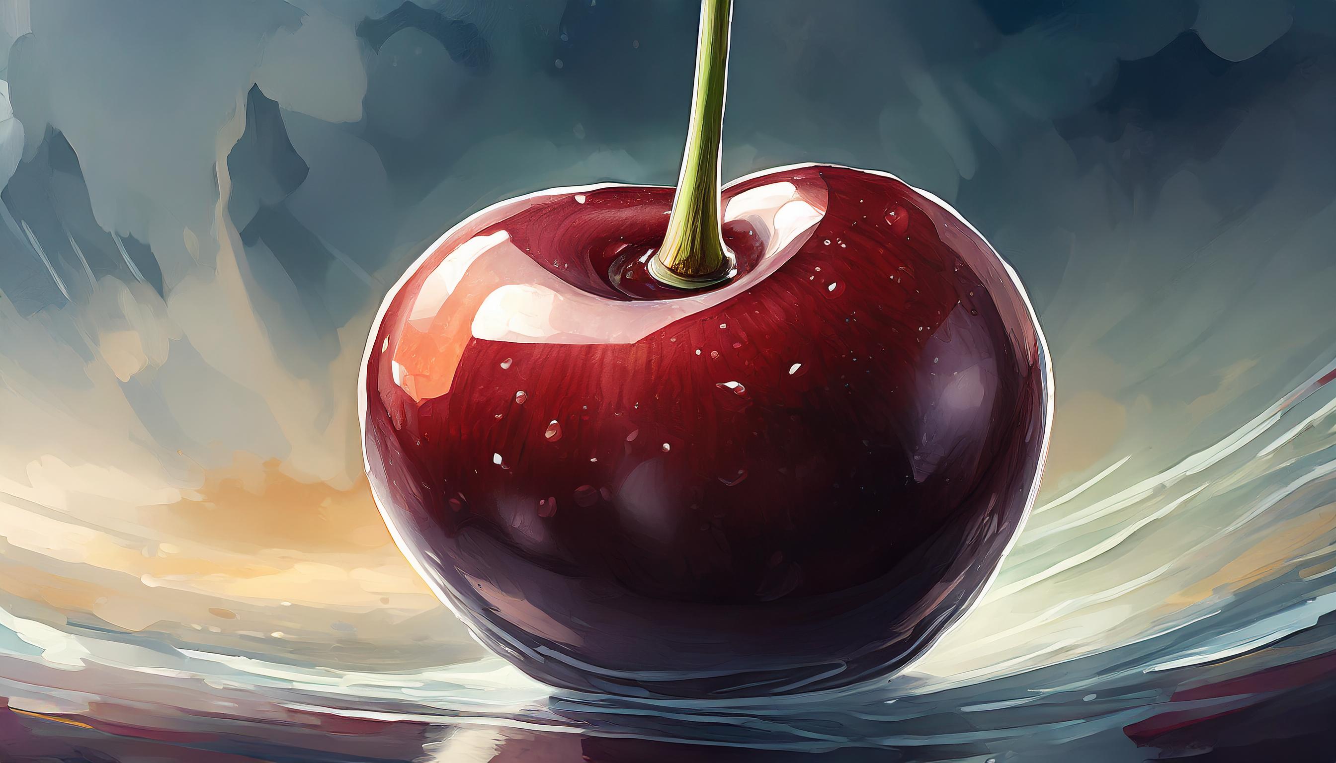 Une image très détaillée et réaliste d'une seule cerise isolée sur un fond blanc uni. Le fruit remplit l'ensemble du cadre sans le dépasser, parfaitement contenu dans les limites. C'est une cerise entière, pas coupée en deux, et il n'y en a qu'une. L'image est très précise, mettant en valeur la texture de la peau de la cerise. La cerise est illuminée par une lumière douce qui parvient encore à souligner sa forme. Il n'y a pas de feuilles attachées à la cerise.