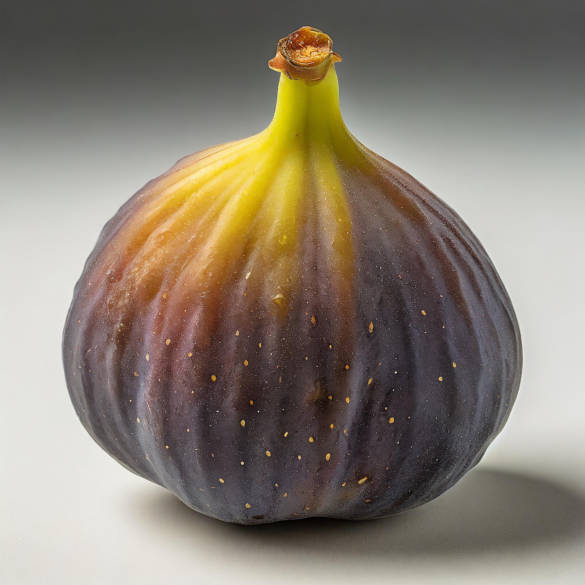 A highly detailed and realistic image of a single fig isolated on a plain white background. The fruit fills the entire frame without overflowing. It is an entire, uncropped fig, with only one fig in the image. The image is very precise, showcasing the texture of the fig's skin. The fig is illuminated by soft light, which still highlights its shape. There are no leaves on the fig.