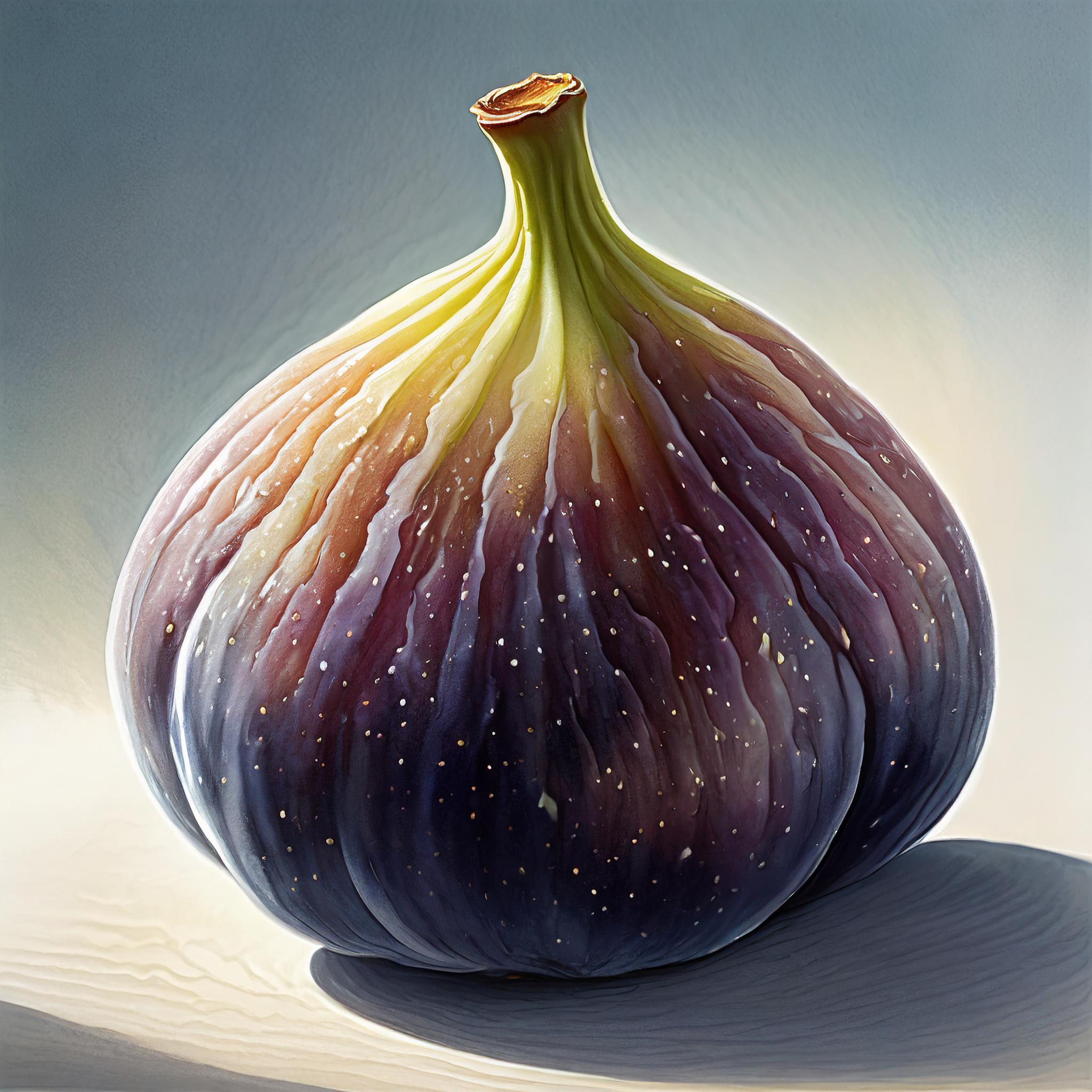 Une image très détaillée et réaliste d'une seule figue isolée sur un fond blanc uni. Le fruit remplit l'ensemble du cadre sans déborder. C'est une figue entière, non coupée, avec une seule figue dans l'image. L'image est très précise, mettant en valeur la texture de la peau de la figue. La figue est illuminée par une lumière douce, qui met encore en valeur sa forme. Il n'y a pas de feuilles sur la figue.