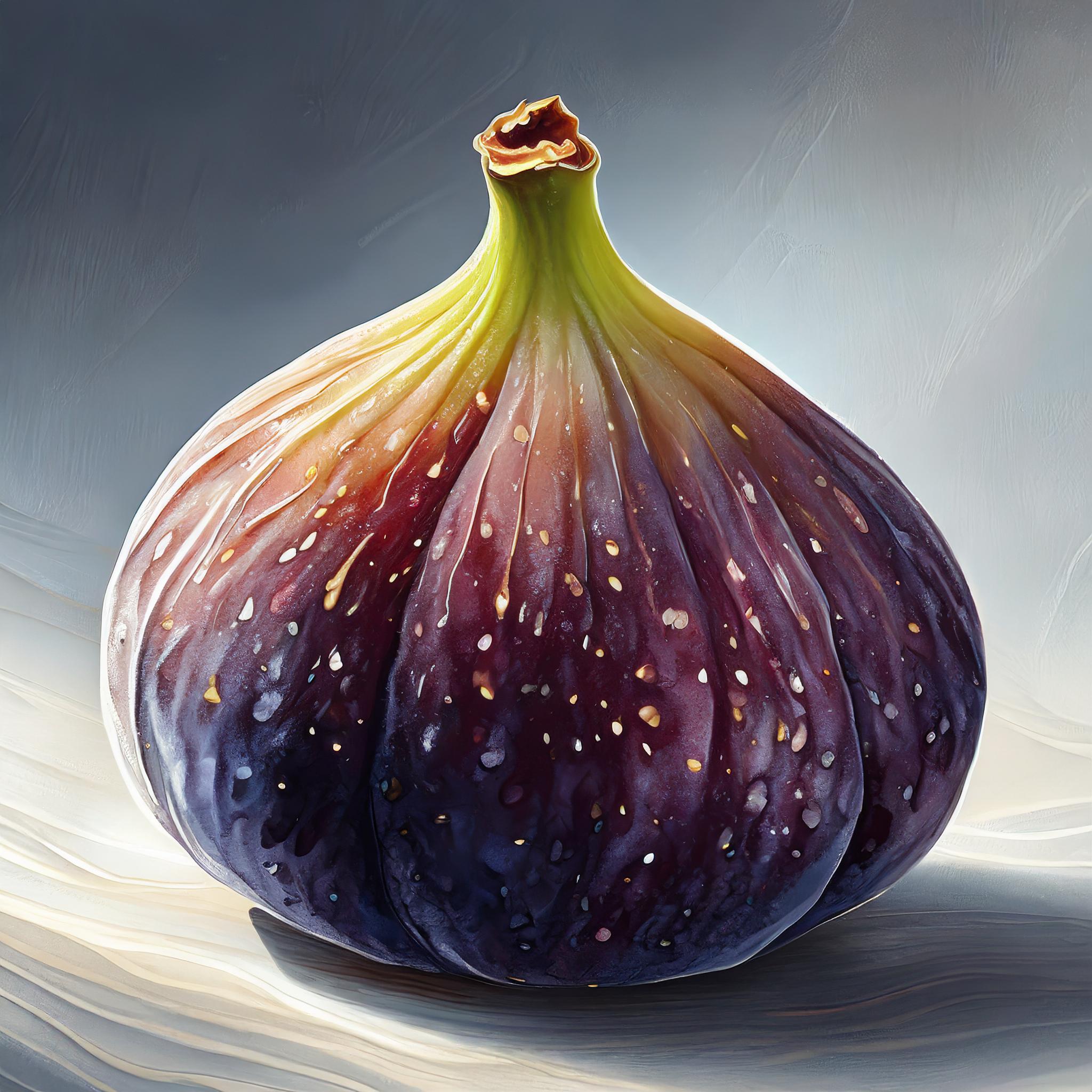 A highly detailed and realistic image of a single fig isolated on a plain white background. The fruit fills the entire frame without overflowing. It is an entire, uncropped fig, with only one fig in the image. The image is very precise, showcasing the texture of the fig's skin. The fig is illuminated by soft light, which still highlights its shape. There are no leaves on the fig.