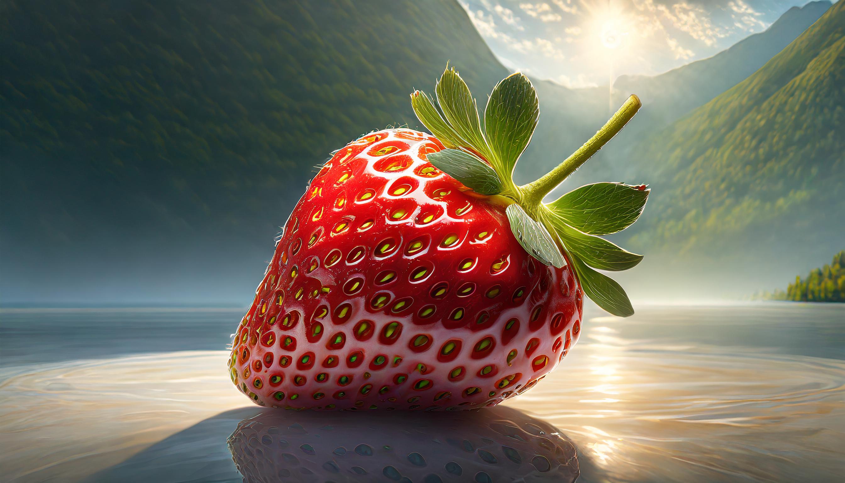 Une image très détaillée et réaliste d'une seule fraise entière isolée sur un fond blanc uni. La fraise occupe tout le cadre sans dépasser ses limites. Le fruit n'est pas coupé en deux, et il n'y a qu'une seule fraise dans l'image. L'image est très précise, mettant en valeur la texture de la peau de la fraise en détail. La fraise est éclairée par une lumière douce, soulignant sa forme sans feuilles. La composition est conçue pour mettre l'accent sur la texture et la forme de la fraise.