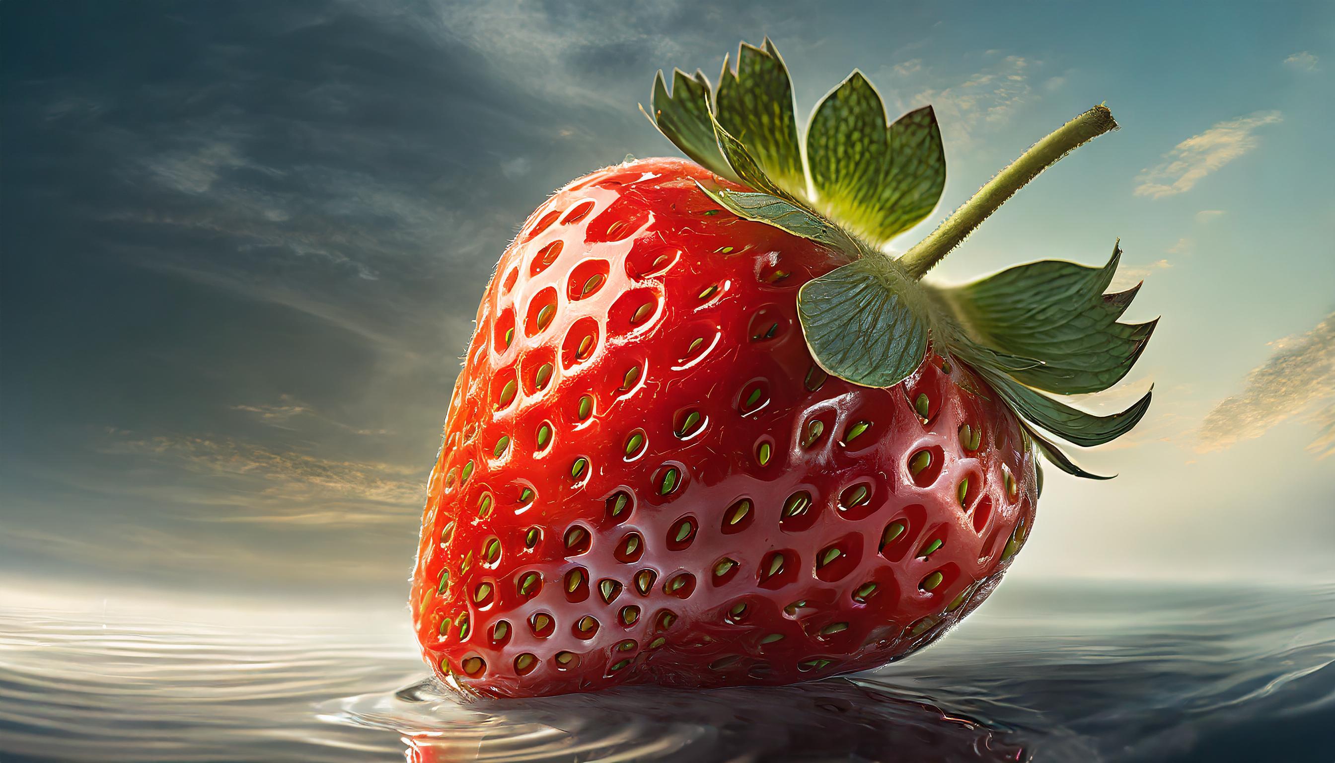 A highly detailed and realistic image of a single, whole strawberry isolated on a plain white background. The strawberry occupies the entire frame without exceeding its boundaries. The fruit is not cut in half, and there is only one strawberry in the image. The image is very precise, showcasing the texture of the strawberry's skin in detail. The strawberry is illuminated by soft light, highlighting its shape without leaves. The composition is designed to emphasize the strawberry's texture and form.