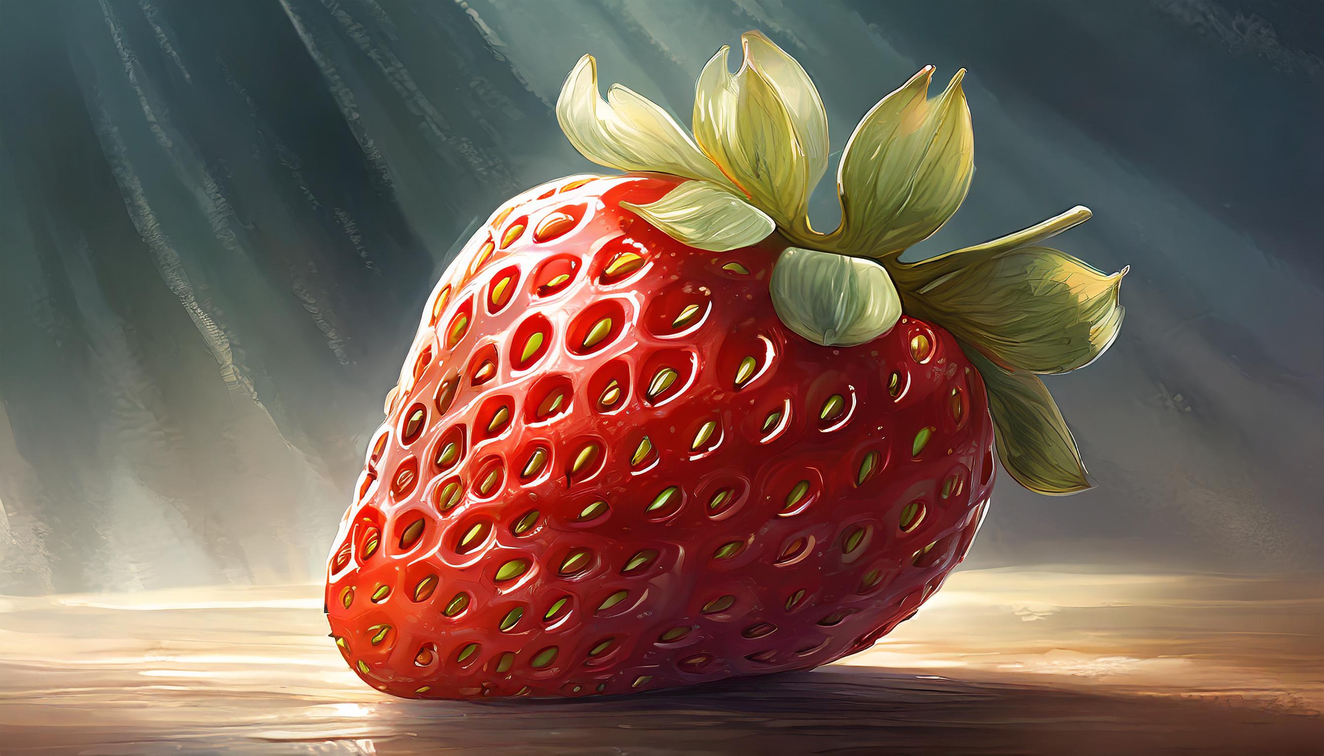A highly detailed and realistic image of a single, whole strawberry isolated on a plain white background. The strawberry occupies the entire frame without exceeding its boundaries. The fruit is not cut in half, and there is only one strawberry in the image. The image is very precise, showcasing the texture of the strawberry's skin in detail. The strawberry is illuminated by soft light, highlighting its shape without leaves. The composition is designed to emphasize the strawberry's texture and form.
