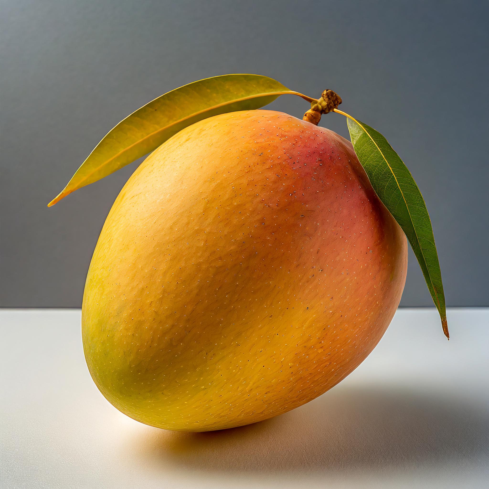 Une image très détaillée et réaliste d'une seule mangue isolée sur un fond blanc uni. Le fruit occupe tout le cadre sans dépasser ses limites. La mangue est entière, non coupée en deux, et il n'y a qu'une seule mangue. L'image est très précise, mettant en avant la texture de la peau de la mangue. La mangue est illuminée par une lumière douce, soulignant sa forme sans feuilles.