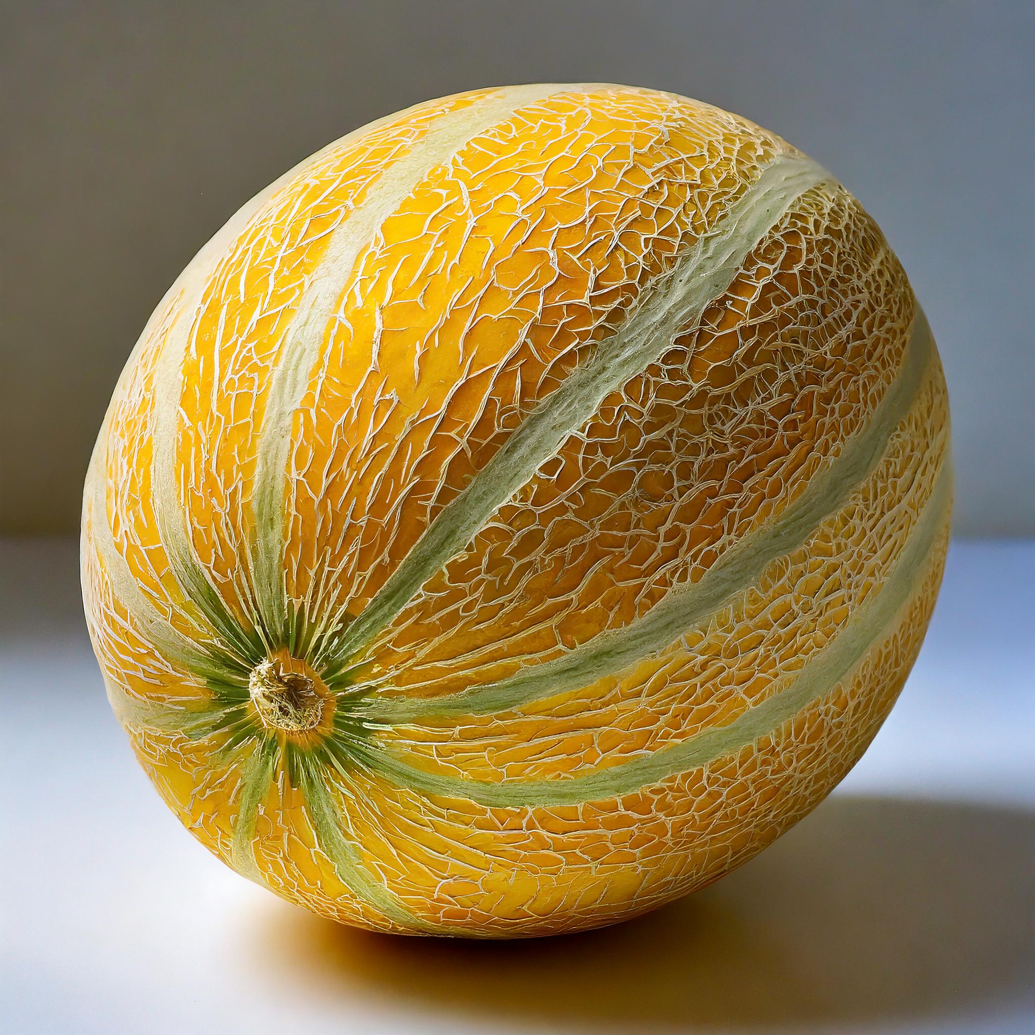 A highly detailed and realistic image of a single whole melon, isolated on a plain white background. The fruit occupies the entire frame without overflowing. The melon is not cut in half, and there is only one melon. The image is very precise, showcasing the texture of the skin. The melon is illuminated by a soft light, which still highlights its shape. The melon is devoid of leaves.