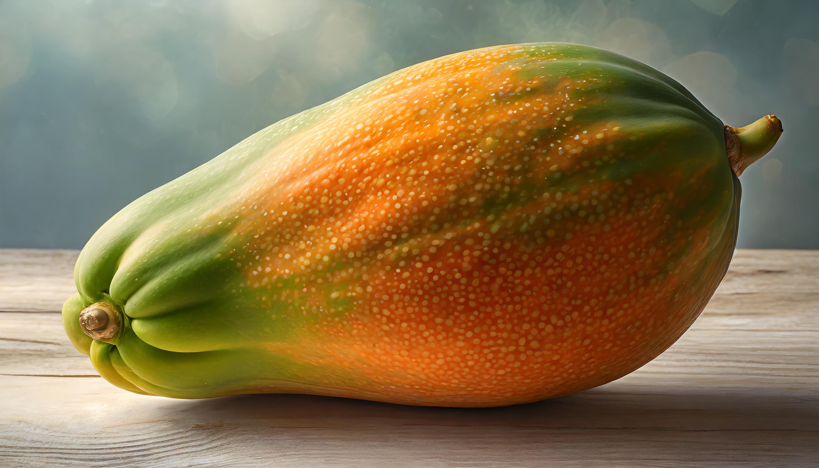 Une image très détaillée et réaliste d'une seule papaye entière isolée sur un fond blanc uni. Le fruit occupe l'ensemble du cadre sans déborder ou excéder les limites. La papaye est entière, non coupée, présentant sa texture de peau de manière vivante sous un éclairage doux qui met en valeur sa forme. Il n'y a pas de feuilles attachées à la papaye.