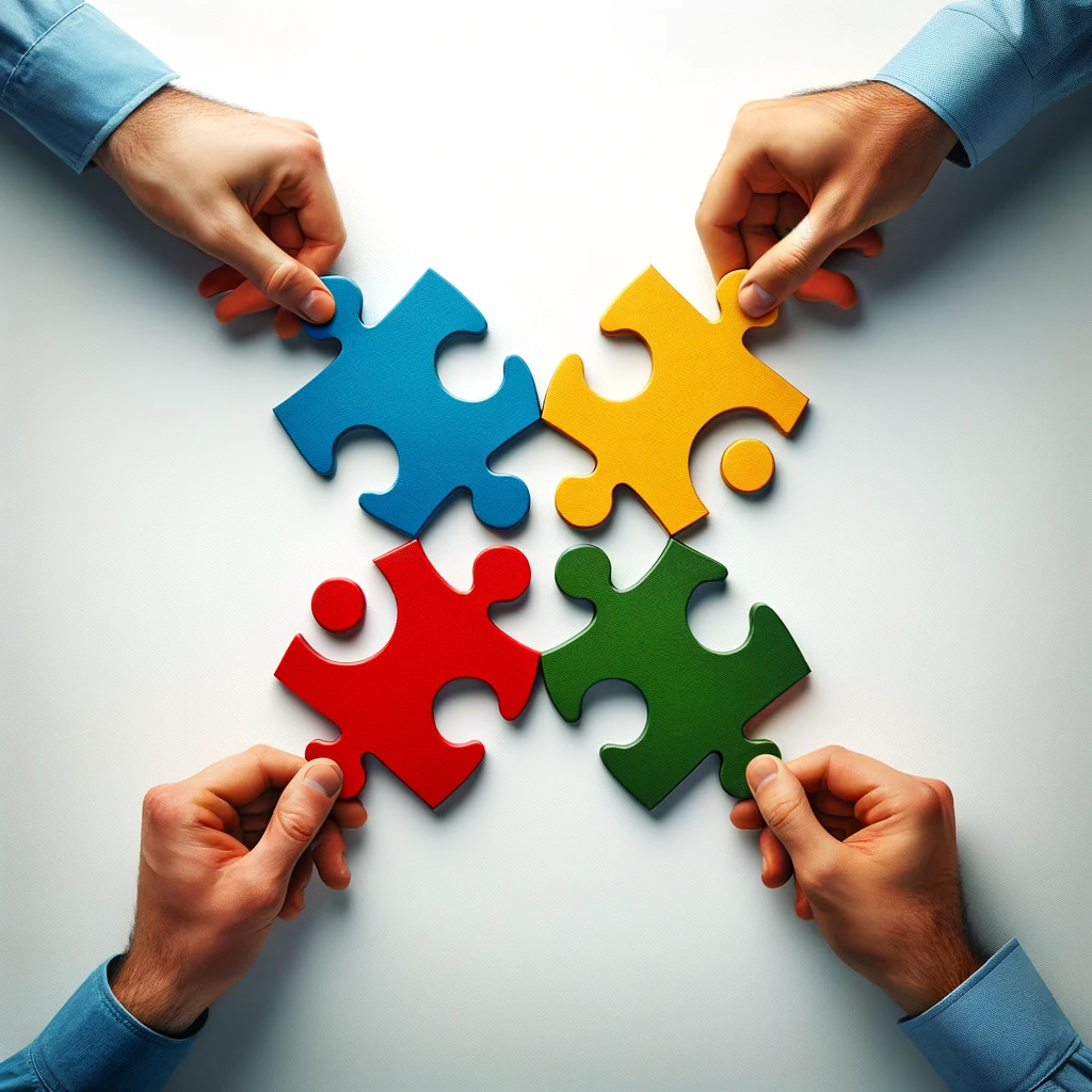 Sur fond blanc, 4 puzzles de couleurs différentes tenus par 4 mains, sont assemblés au centre de l'image.