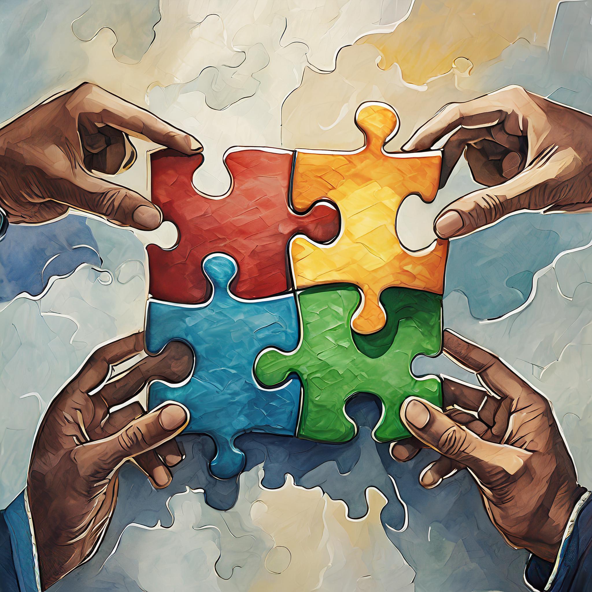 Sur un fond blanc, quatre pièces de puzzle de différentes couleurs sont tenues ensemble par quatre mains au centre de l'image. Chaque pièce de puzzle est d'une couleur distincte - rouge, bleu, vert et jaune. Les mains sont positionnées à partir des coins de l'image, chacune tenant une pièce de puzzle, et elles se rejoignent au milieu pour emboîter les pièces les unes dans les autres. L'image devrait capturer le moment juste avant que les pièces ne s'imbriquent, mettant en valeur un sens du travail d'équipe et de la collaboration.
