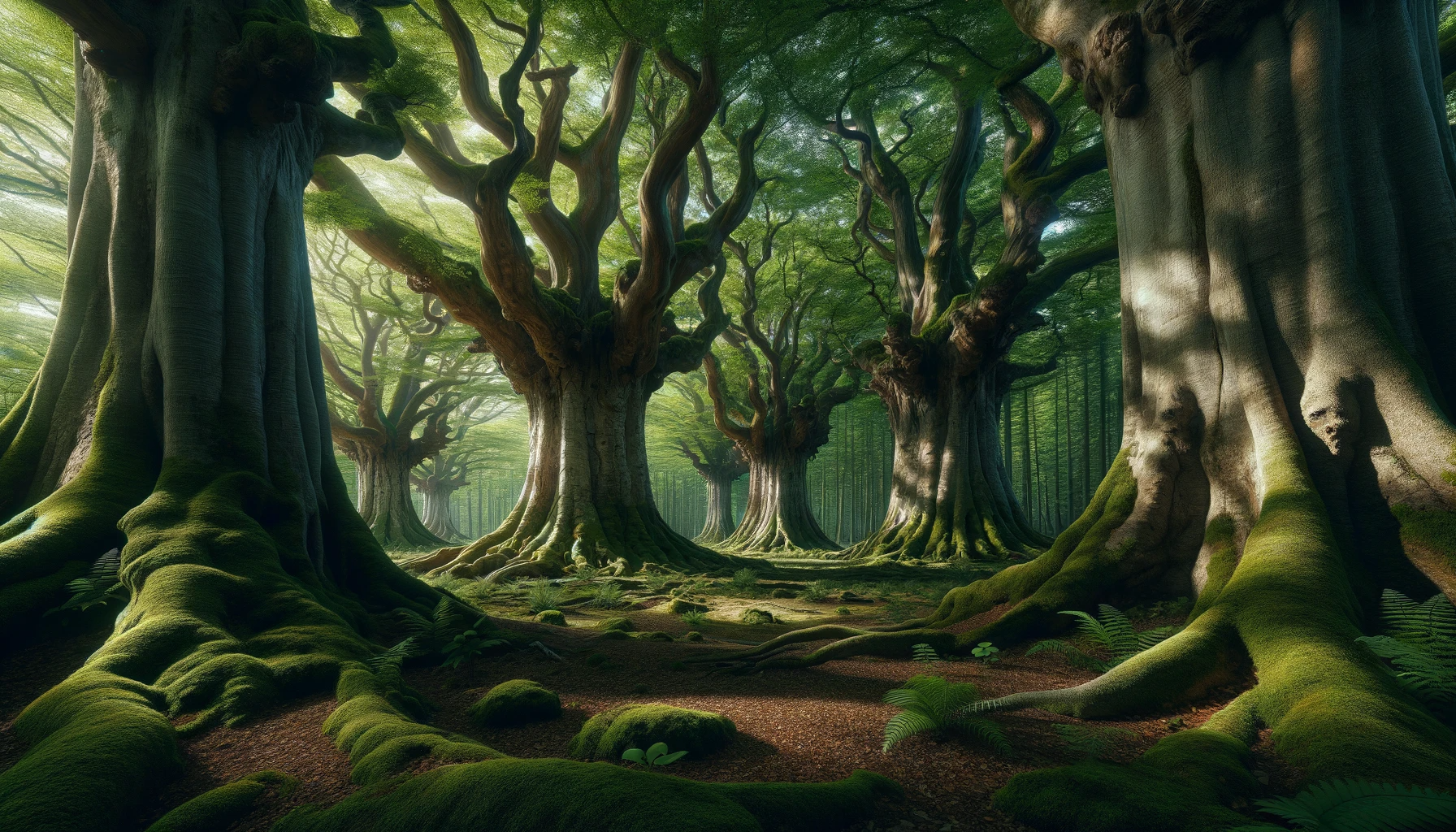 Une image très réaliste de l'intérieur d'une forêt ancienne, remplie d'arbres centenaires. Ces arbres majestueux ont des troncs épais et noueux et une dense canopée de feuilles, projetant un jeu de lumière et d'ombre sur le sol de la forêt. Le sol est recouvert d'une couche luxuriante de mousse, de fougères et de feuilles tombées, contribuant à l'atmosphère sereine et intemporelle de cette forêt ancienne
