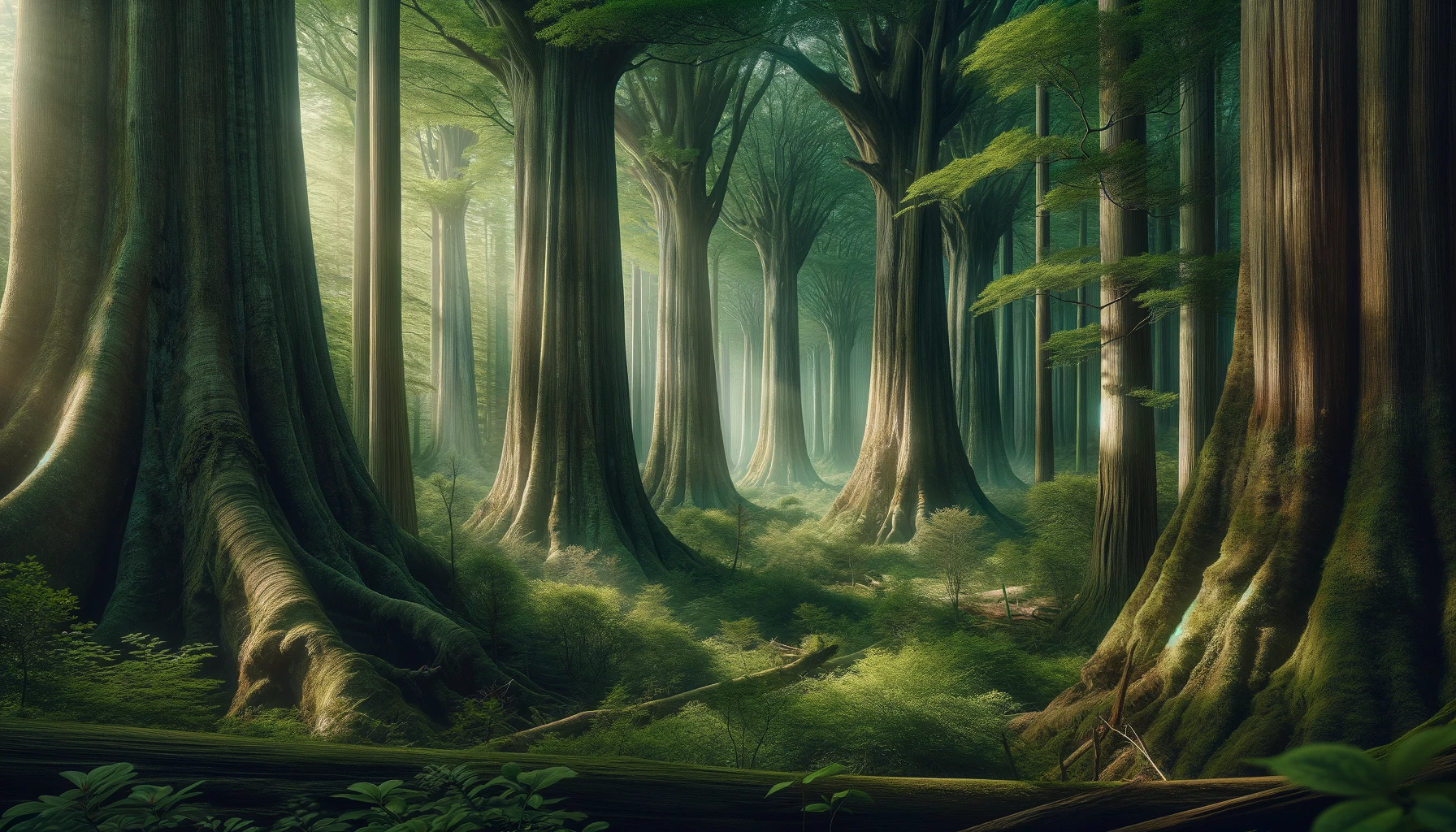 Une image réaliste de l'intérieur d'une forêt remplie d'arbres anciens et imposants, avec des troncs épais et noueux, suggérant qu'ils ont plusieurs siècles. La canopée dense au-dessus filtre la lumière du soleil en faisceaux doux, créant une atmosphère sereine, presque mystique. Le sol de la forêt est recouvert d'une végétation luxuriante et de feuilles occasionnelles tombées, ajoutant à la sensation d'intemporalité et à la beauté naturelle de cette forêt ancienne.