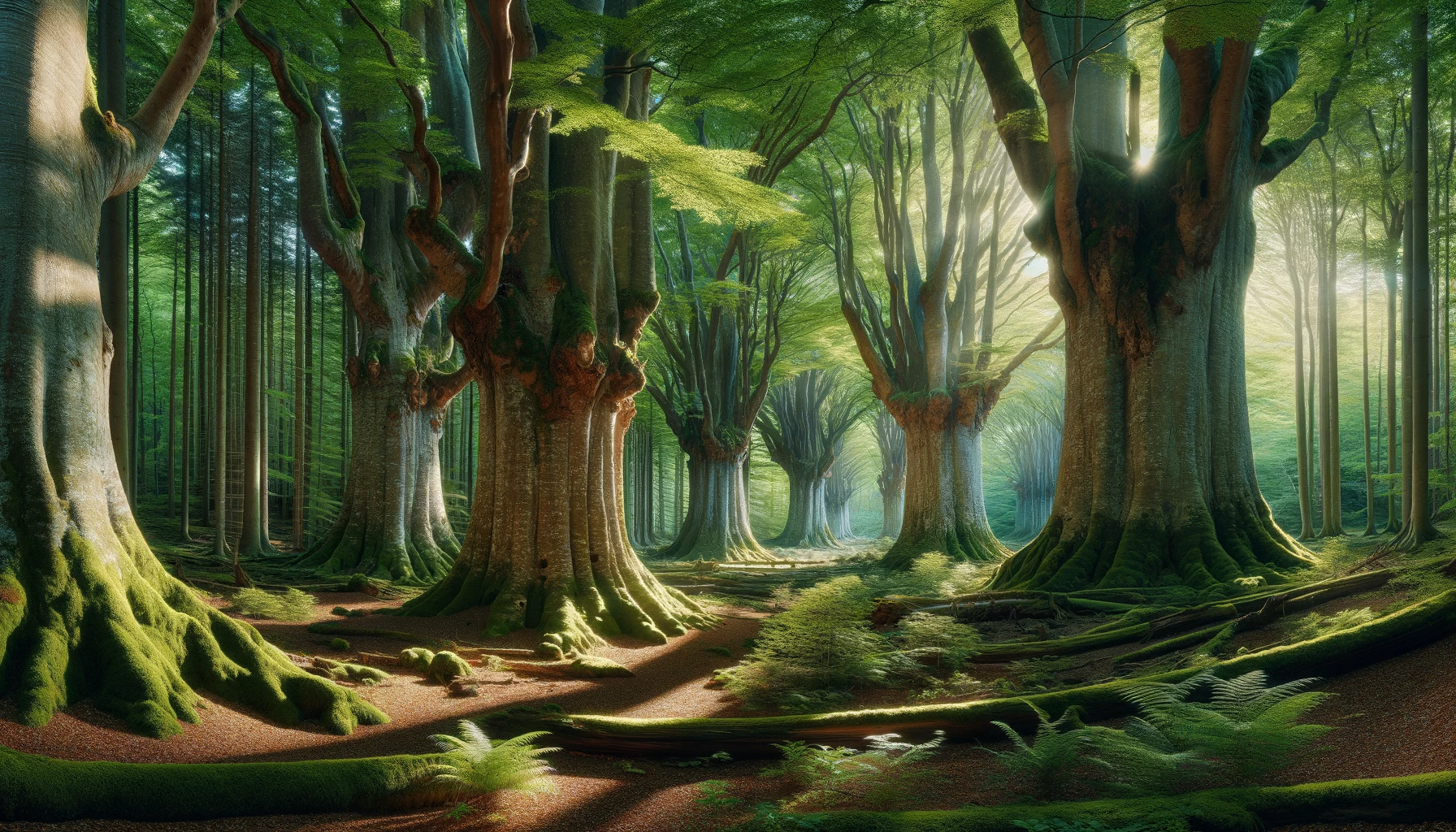 A highly realistic image of the interior of an ancient forest, filled with centenarian trees. These majestic trees have thick, gnarled trunks and a dense canopy of leaves, casting a pattern of light and shadow on the forest floor. The ground is covered with a lush layer of moss, ferns, and fallen leaves, adding to the serene and timeless atmosphere of this old-growth forest.