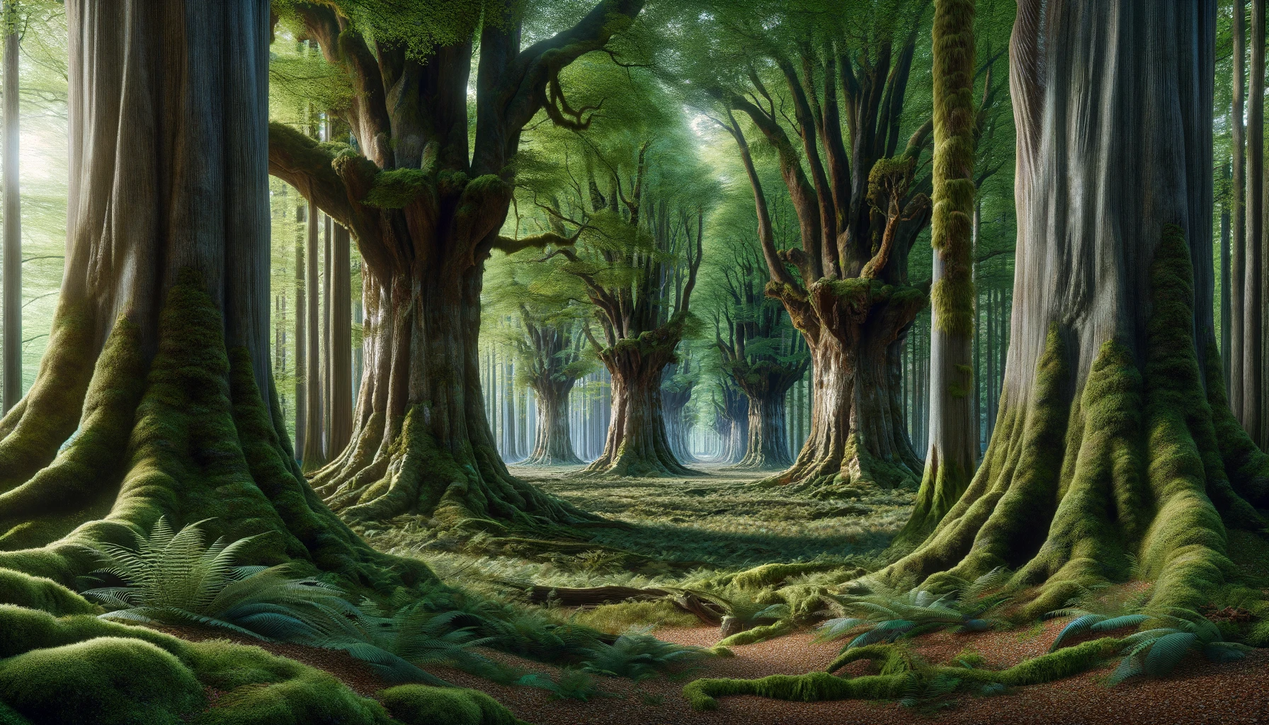 A highly realistic image of the interior of an ancient forest, filled with centenarian trees. These majestic trees have thick, gnarled trunks and a dense canopy of leaves, casting a pattern of light and shadow on the forest floor. The ground is covered with a lush layer of moss, ferns, and fallen leaves, adding to the serene and timeless atmosphere of this old-growth forest.