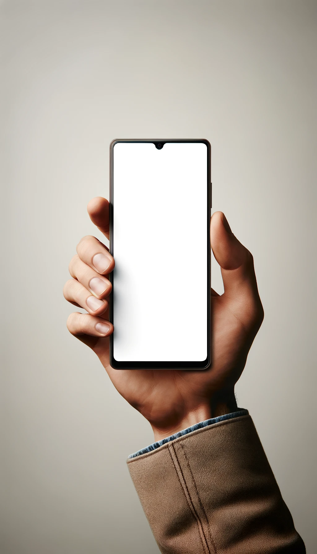 Générer une image d'une main tenant un smartphone directement vers le spectateur. L'écran entier du smartphone doit être visible et complètement blanc, sans texte, images ou icônes. Le smartphone doit être de conception moderne avec un cadre étroit. La main présente le téléphone avec l'écran occupant la majeure partie de la zone de l'image, et l'arrière-plan doit être simple et épuré pour maintenir l'accent sur le smartphone.