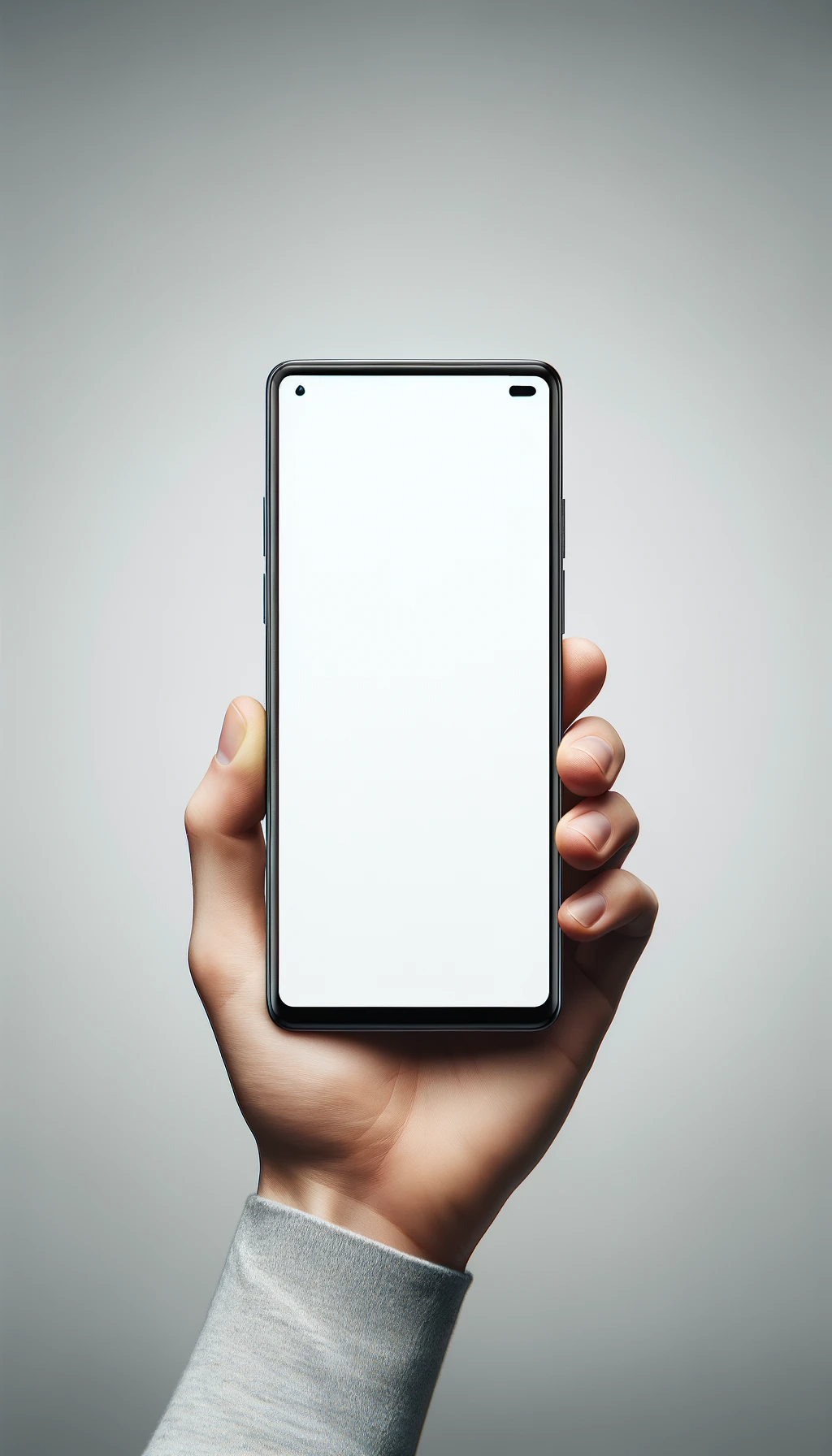 Créer une image d'une main, vue d'une perspective à la première personne, tenant un smartphone face directement au spectateur. Le smartphone doit occuper la majorité de l'image, avec un design moderne présentant des bordures minimales. L'ensemble de l'écran doit être visible et affiché comme un écran blanc simple et non allumé, suggérant qu'il est éteint ou dans un état vierge. L'arrière-plan doit être neutre, assurant que le smartphone soit le principal point focal de l'image.