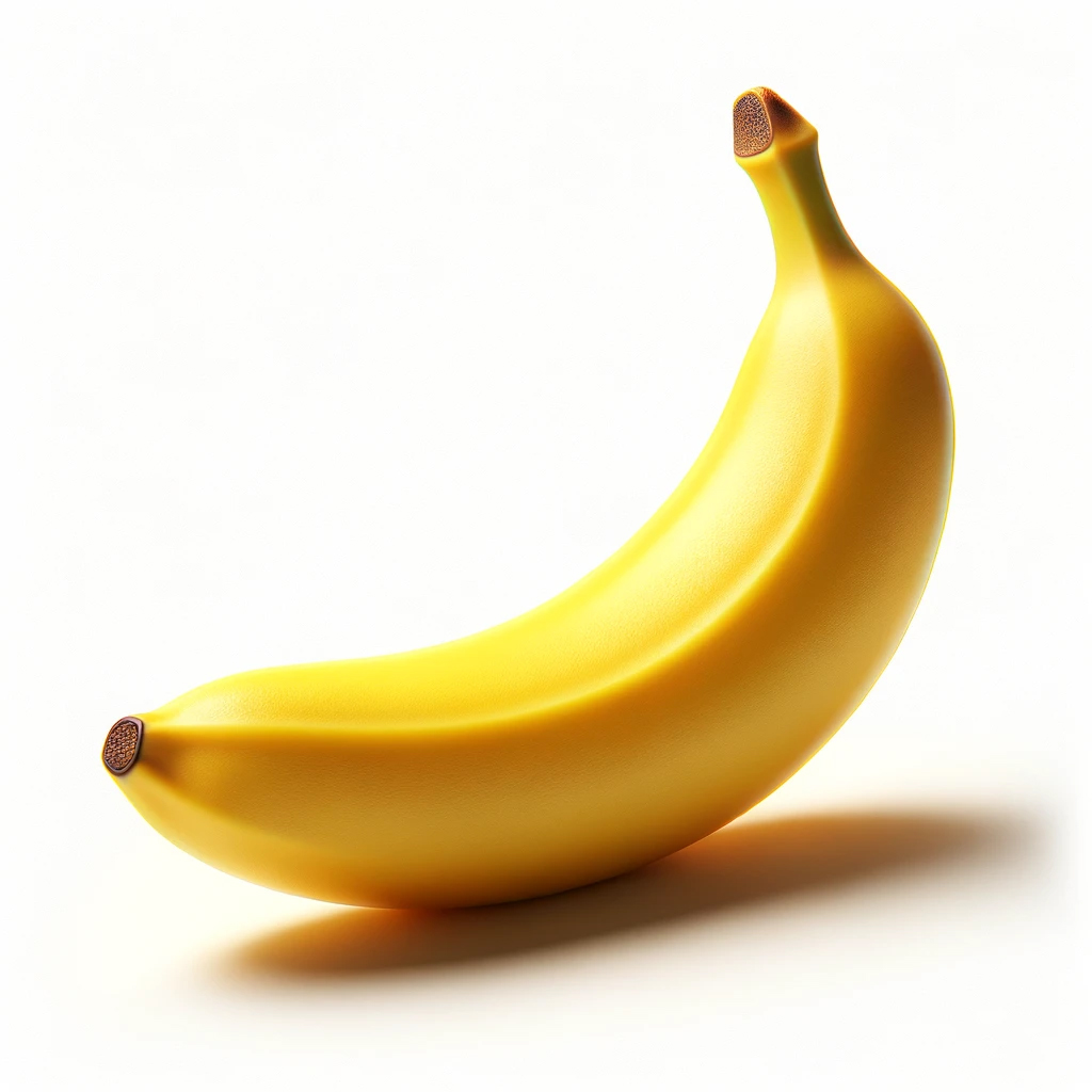 Une image très détaillée et réaliste d'une banane jaune isolée sur un fond blanc uni. Le fruit occupe l'ensemble du cadre sans le dépasser, sans déborder. Une banane entière, non coupée en deux, et il n'y a qu'une seule banane. L'image est très précise, ce qui permet d'apprécier la texture de la peau. La banane est éclairée par une lumière douce, permettant tout de même de mettre en valeur sa forme. La banane est dépourvue de feuilles.