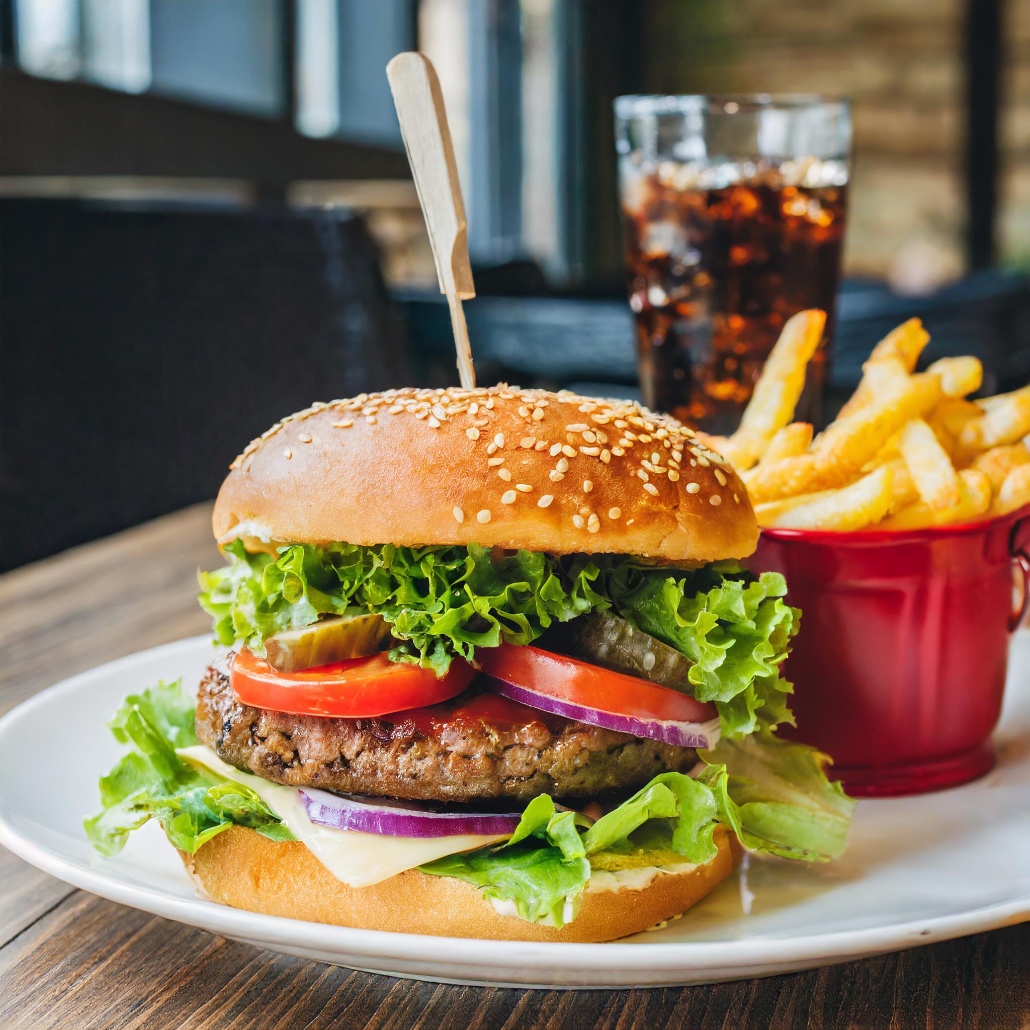 On a restaurant table in close-up, a large hamburger with fries and a drink is served in the foreground, with a front view.