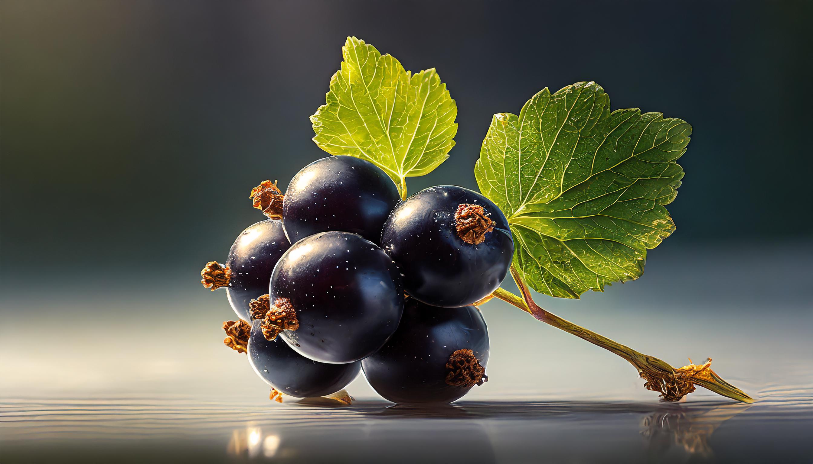 A very detailed and realistic image of a single blackcurrant isolated on a plain white background. The fruit occupies the entire frame without overflowing or exceeding the boundaries. An intact, whole blackcurrant, not cut in half, and there's only one blackcurrant in the image. The image is very precise, allowing for appreciation of the skin texture. The blackcurrant is illuminated by soft light, still highlighting its shape. The blackcurrant is without leaves.