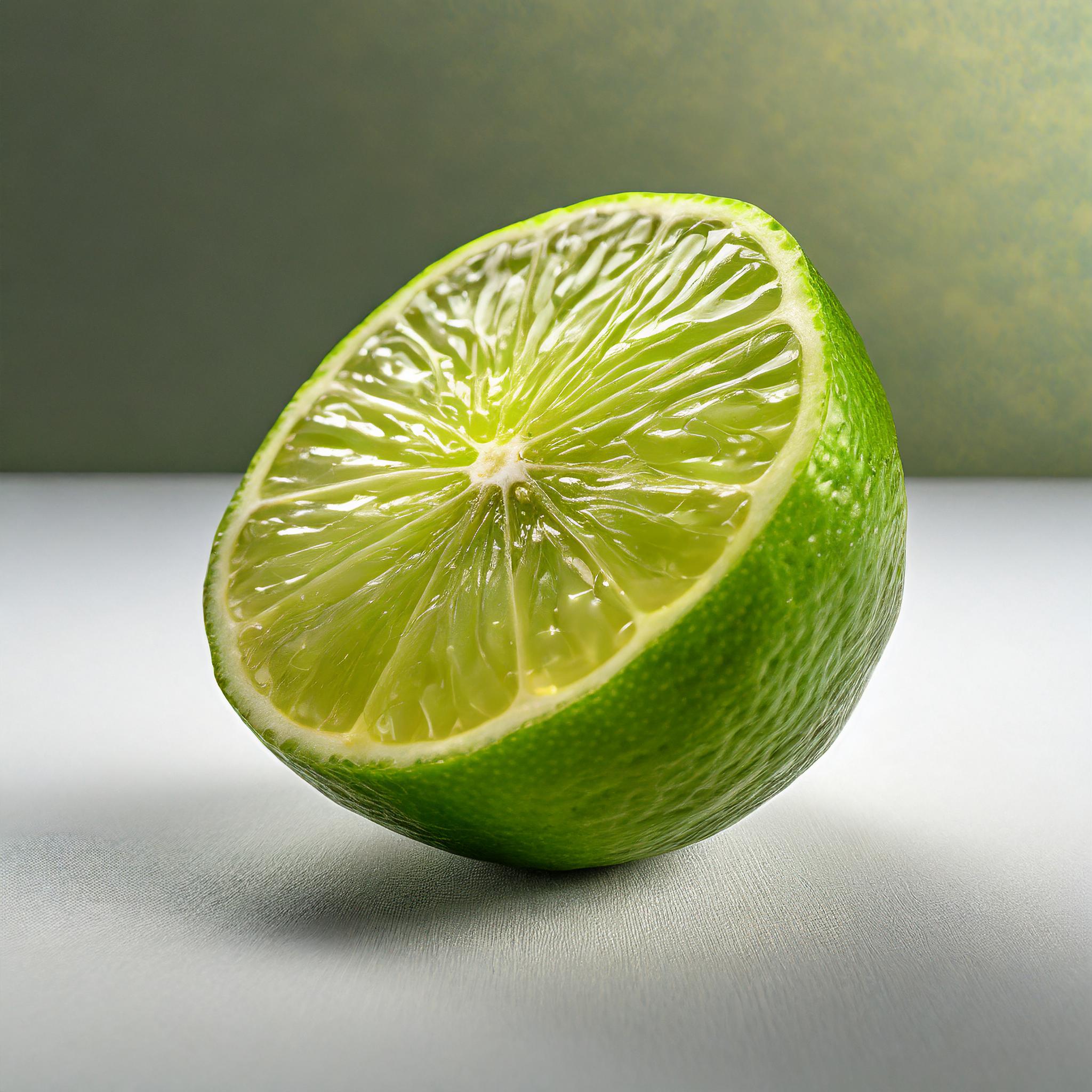 A very detailed and realistic image of a single, whole lime isolated on a plain white background. The lime occupies the entire frame without overflowing. The lime is not cut in half, showcasing a single, uncut lime. The image is very precise, highlighting the texture of the lime's skin. The lime is illuminated by soft light, enhancing its shape. There are no leaves attached to the lime.