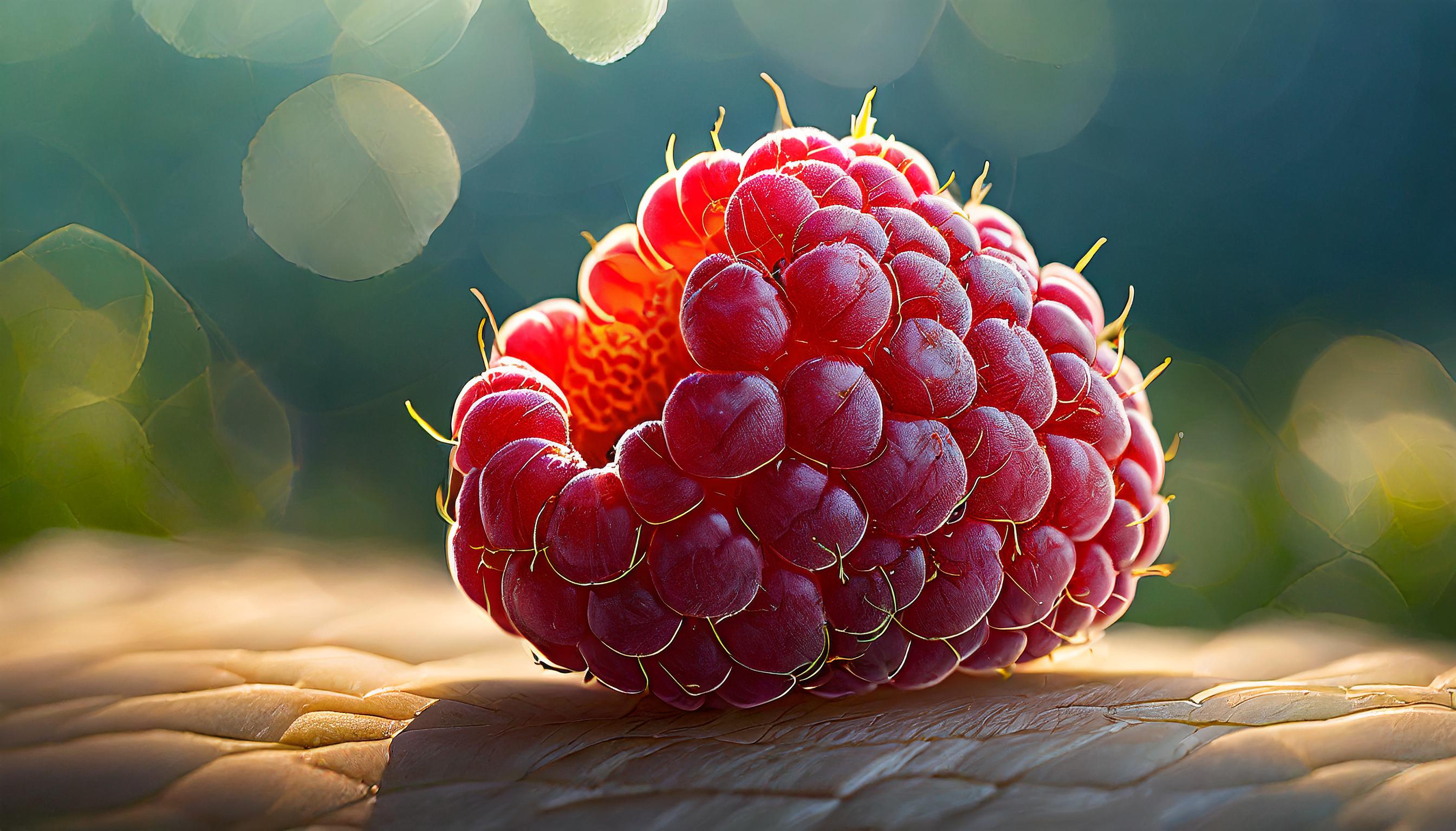 A highly detailed and realistic image of a single raspberry isolated on a plain white background. The fruit fills the frame without exceeding its limits or overflowing. The raspberry is whole, not cut in half, and there's only one raspberry. The image is very precise, showcasing the texture of the skin. The raspberry is illuminated by soft light, highlighting its shape. The raspberry is without leaves.
