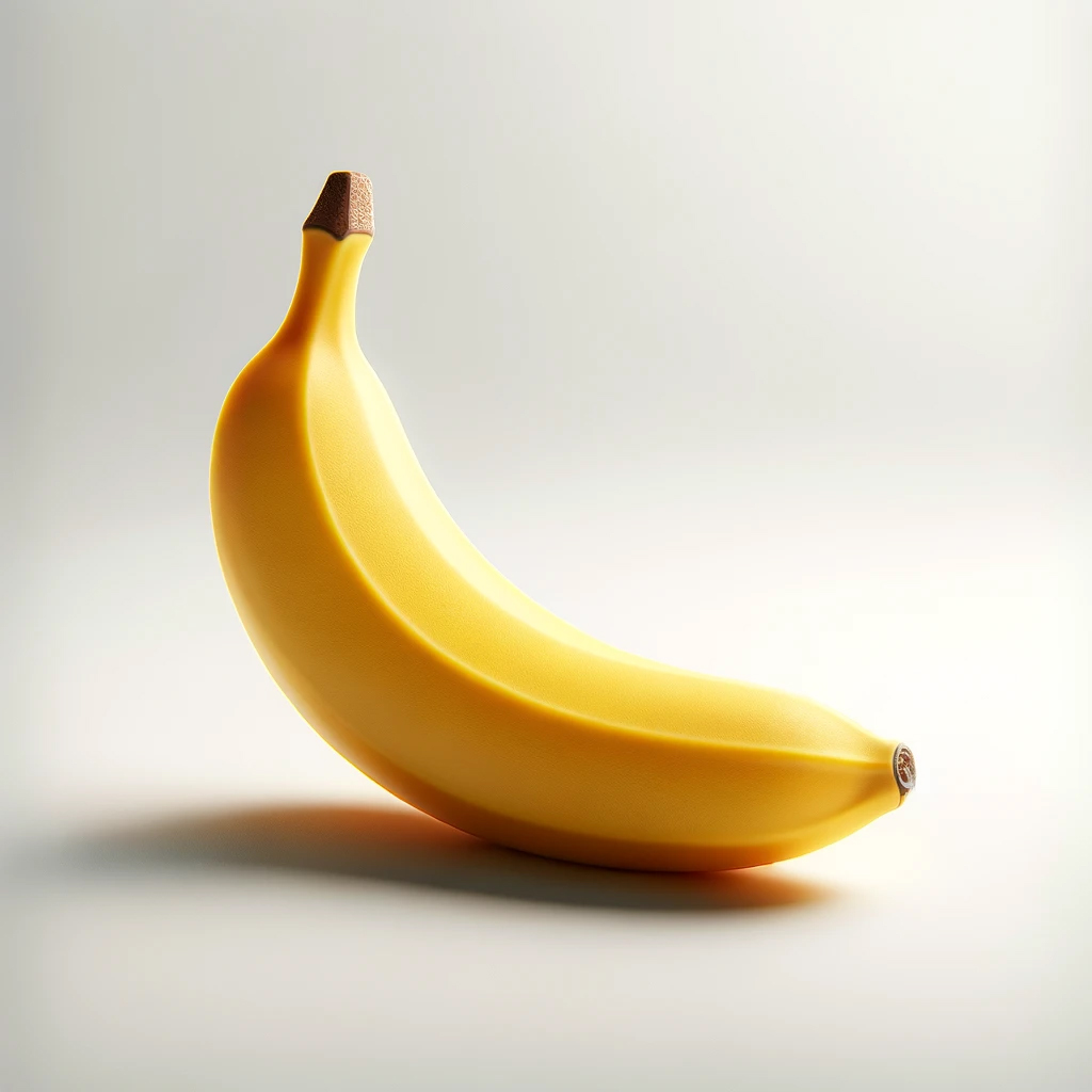 Une image très détaillée et réaliste d'une banane jaune isolée sur un fond blanc uni. Le fruit occupe l'ensemble du cadre sans le dépasser, sans déborder. Une banane entière, non coupée en deux, et il n'y a qu'une seule banane. L'image est très précise, ce qui permet d'apprécier la texture de la peau. La banane est éclairée par une lumière douce, permettant tout de même de mettre en valeur sa forme. La banane est dépourvue de feuilles.