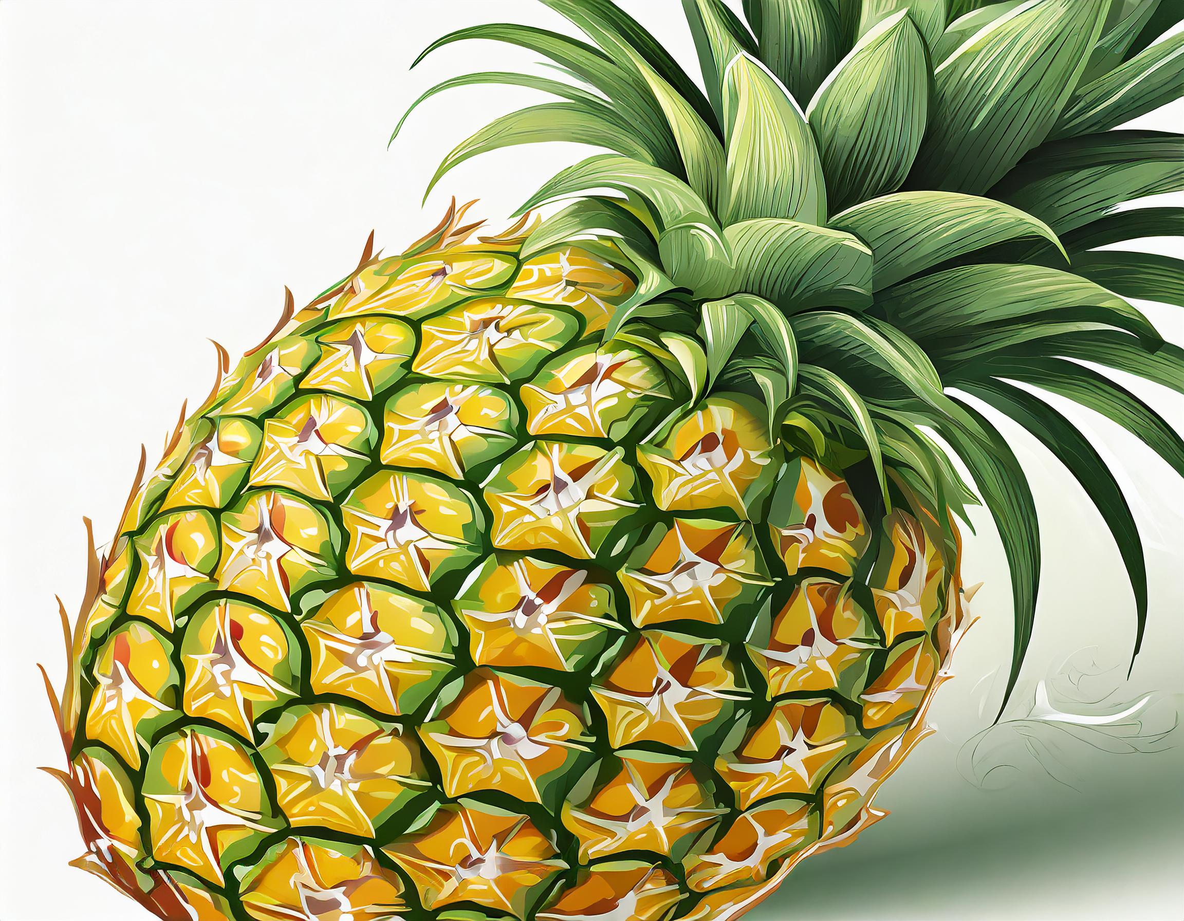 A highly detailed and realistic image of a single pineapple isolated on a plain white background. The fruit fills the entire frame without overflowing. The pineapple is whole, not cut in half, and there is only one pineapple. The image is very precise, showcasing the texture of the pineapple's skin. It is illuminated by a soft light, highlighting its shape. The pineapple is without leaves.