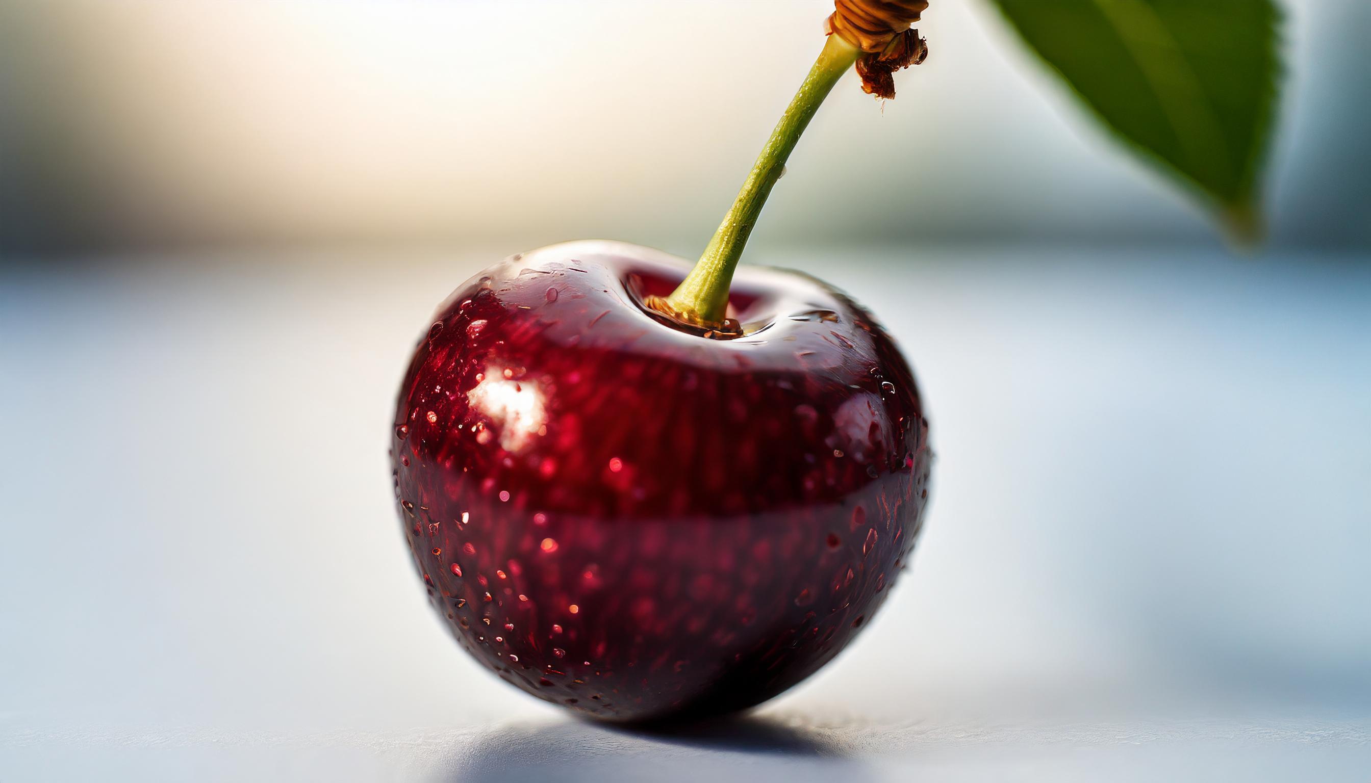 A highly detailed and realistic image of a single cherry isolated on a plain white background. The fruit fills the entire frame without exceeding it, perfectly contained within the boundaries. It's a whole cherry, not cut in half, and there's only one. The image is very precise, showcasing the texture of the cherry's skin. The cherry is illuminated by a soft light that still manages to highlight its shape. There are no leaves attached to the cherry.