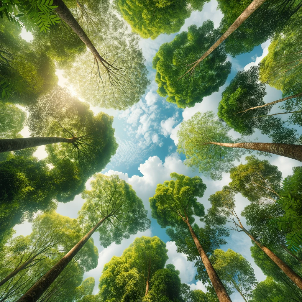 Une vue en contre-plongée de cinq arbres avec un feuillage dense couvrant une grande partie de l'image, donnant l'impression que quelqu'un regarde vers le haut. Le ciel, partiellement nuageux avec une couleur bleu clair, est visible à travers les feuilles. Cette scène ressemble à une belle journée de fin de printemps.